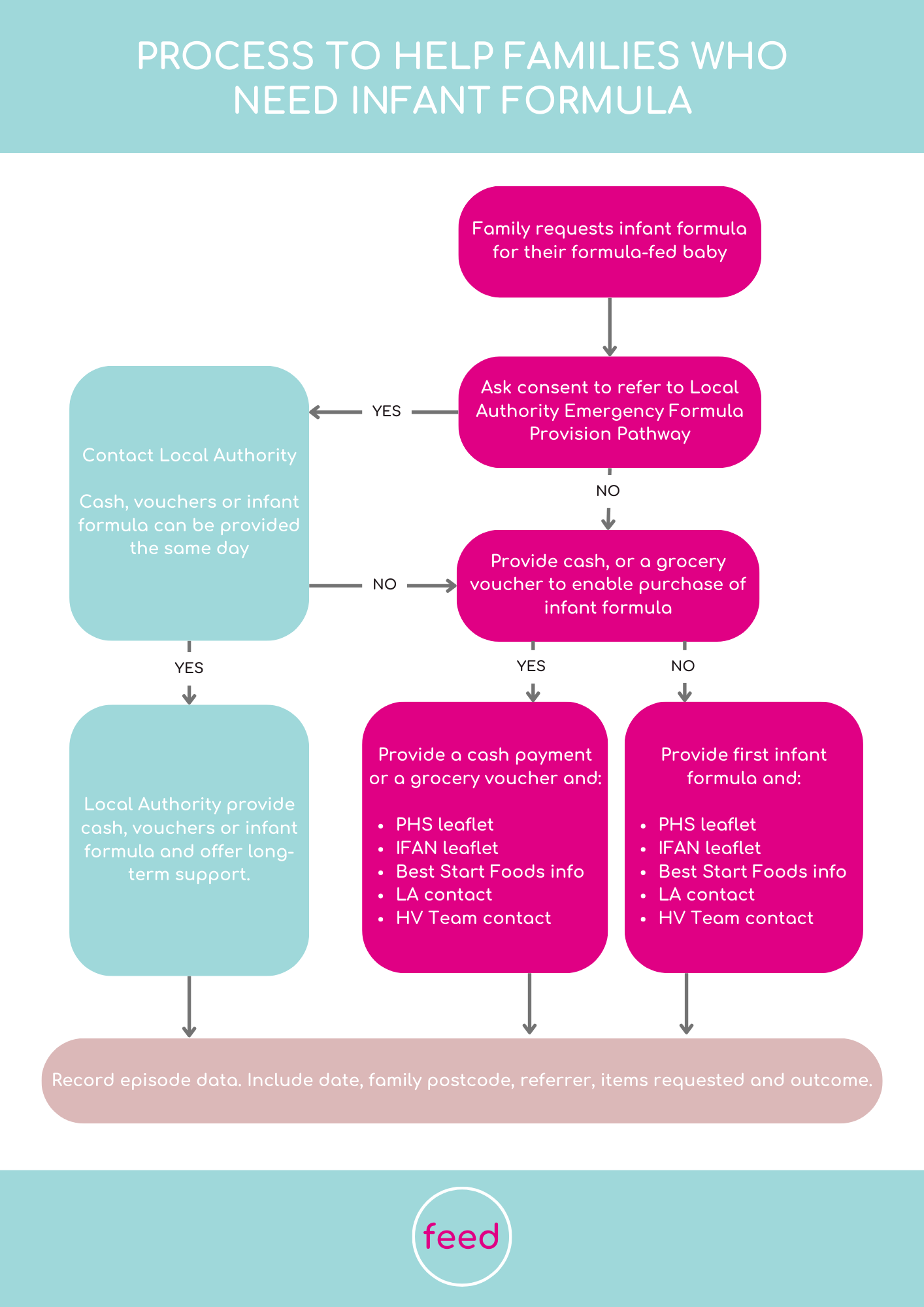 All local areas in the UK should have a pathway for the provision of infant formula milk to a formula fed infant in a crisis situation. Your service might be incorporated into or sit outside of this pathway. Best practice is to be aware of these provisions and work together with your Local Authority to support families in need.