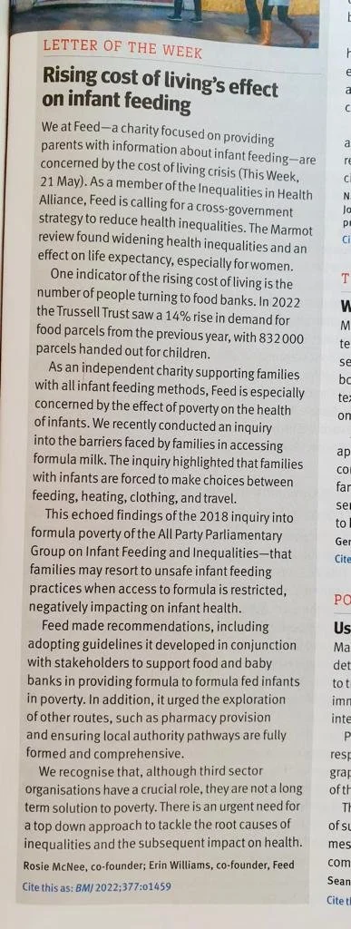 In May 2022, the BMJ published an article outlining how the rising cost of living is impacting on peoples health. We responded, highlighting the particular impact on infants, and describing the finding of our research. We reiterated our commitment as a member of the Inequalities in Health Alliance in urging the government to take action to improve the social determinants of health half of UK people. Our response was not only published in the online journal, but made it into print as Letter of the Week!